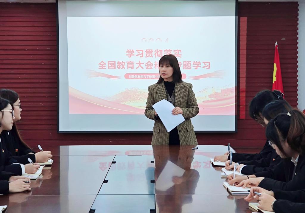 学院党委书记綦明霞以《学习贯彻落实全国教育大会精神专题学习》为题,围绕“锚定建成教育强国的战略目标”“我们要建成怎样的教育强国”“全面推进教育强国建设的战略任务和重大举措”三方面带领大家深入解读习近平总书记在2024年全国教育大会上的重要讲话精神,鼓励全体学员积极响应党中央的号召,将改革创新精神融入专业学习与实践中,全面提升自身素质,强化先锋引领,坚定理想信念,锤炼能力素质,争当教育专业化人才。
