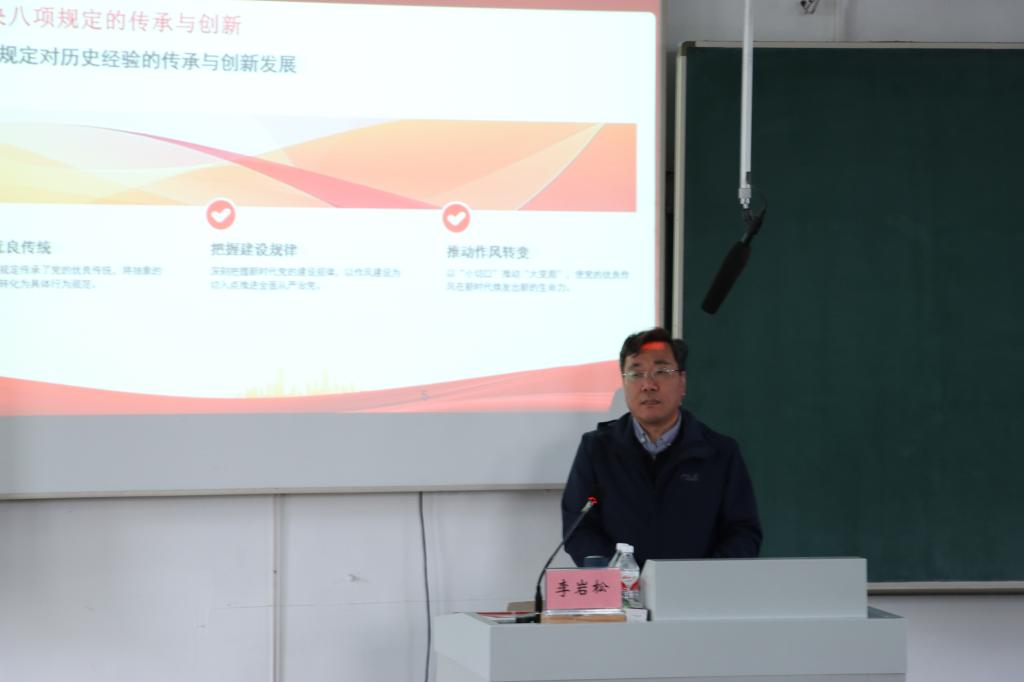 李岩松副教授以《八项规定、党的作风建设与国家治理现代化》为主题展开宣讲,从党的作风建设历史传承与发展、党的作风建设破解国家治理难题、党的作风建设推动国家治理制度现代化、新时代深化作风建设提升治理效能的实践方法、党的作风建设与国家治理现代化前瞻五个方面展开,指出通过持续深化作风建设,优良的党风政风推动形成良好社会氛围,以永远在路上的执着,能够交出人民满意的答卷。全体师生要深刻领会中央八项规定精神的核心要义,自觉抵制各种不正之风,做到廉洁修身、廉洁治学、廉洁育人。