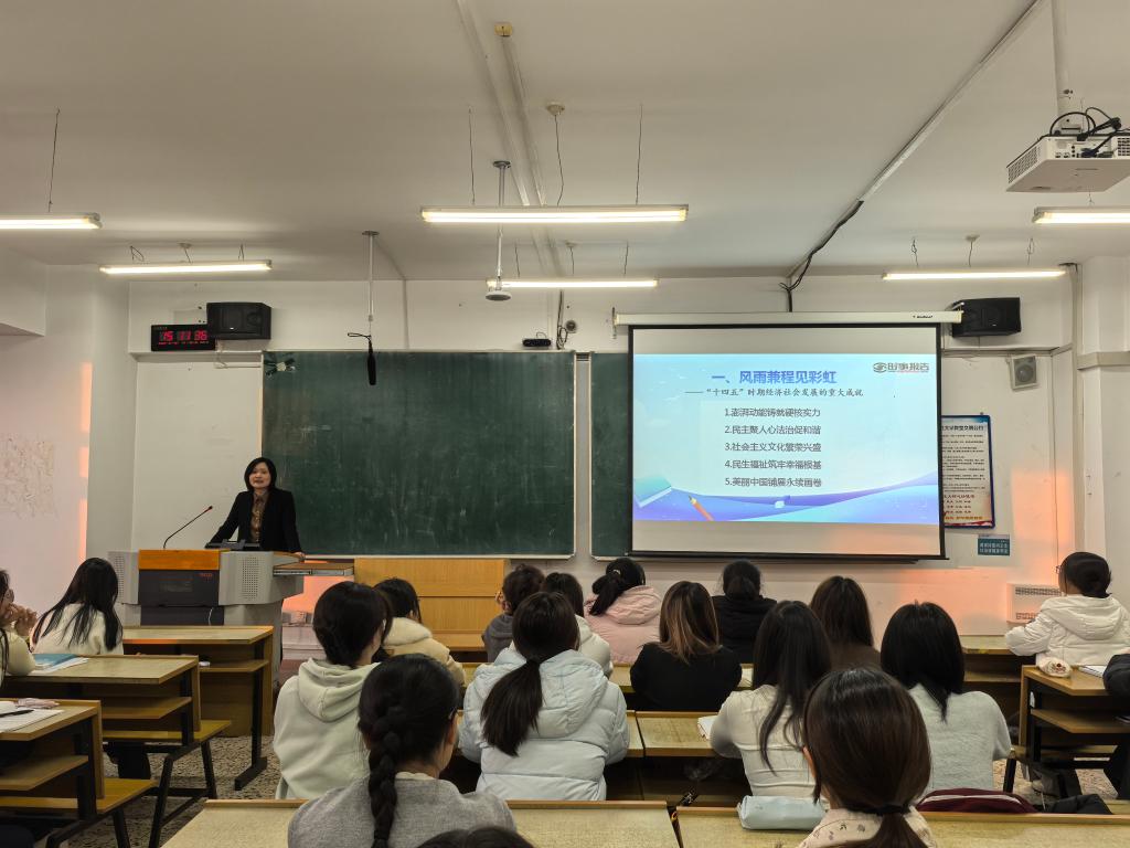 闫隽以《决胜“十四五” 奋发向前行》为题,介绍“十四五”以来取得的发展成就、我国应对挑战和实现发展的宝贵经验,以及“十五五”时期的时与势。指出2025年是“十四五”规划收官、“十五五”规划谋篇布局的承上启下之年,同学们要深刻把握其时代意义,善用系统思维、辩证思维、创新思维分析问题、解决问题,在专业领域深耕细作,在创新创业中突破壁垒,在社会实践中扎根成长,为国家现代化建设贡献智慧与力量。