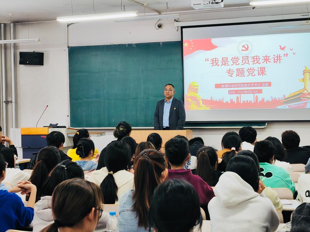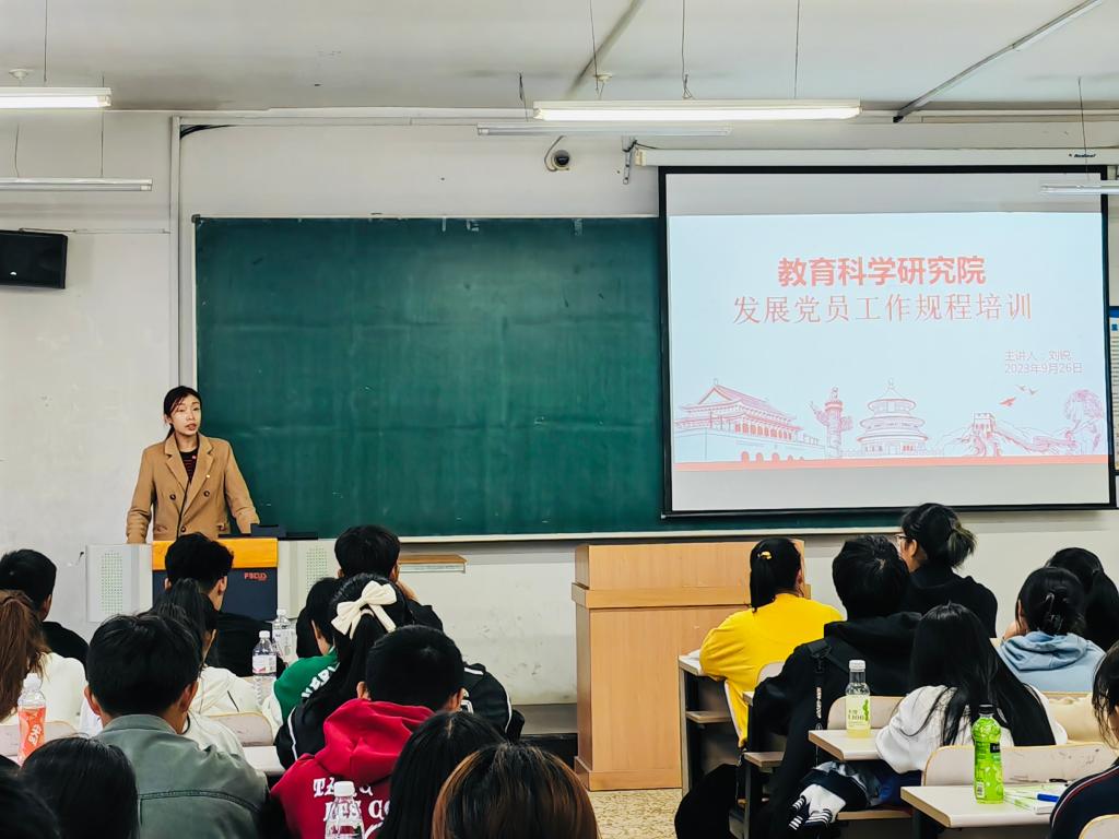 为做好2023级新生思想政治教育,加强对党的认识,端正入党动机,引导2023级新生积极向党组织靠拢,2023年9月26日12时30分,教育科学研究院于汇文楼332教室开展2023级新生入党启蒙教育。会议由学院组织员刘锐主持,学院党总支书记金鹏、2023级全体同学参会。