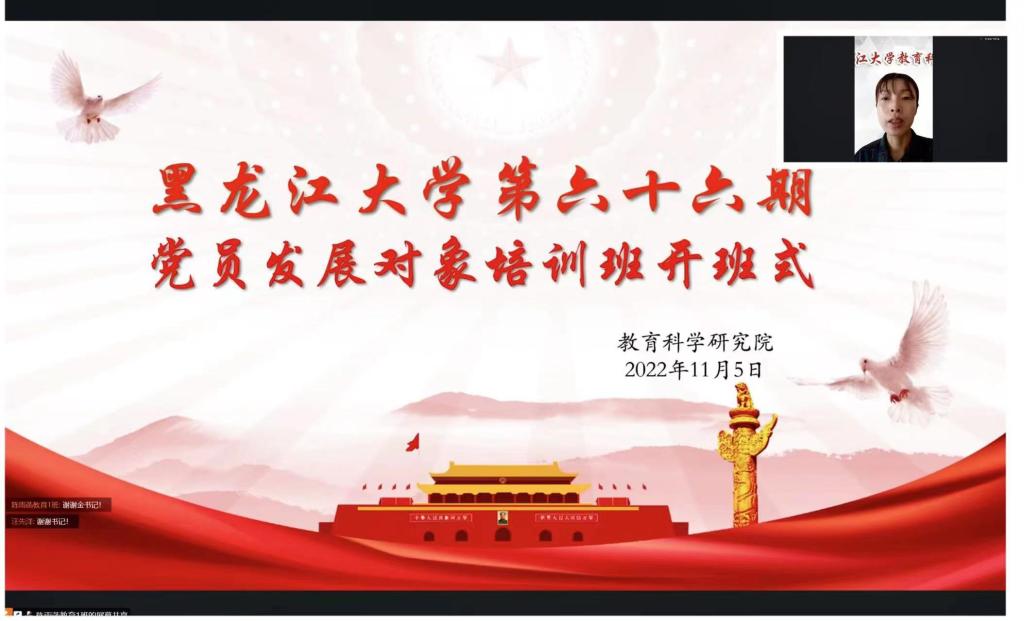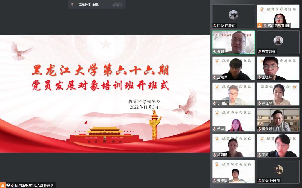 为认真学习习近平新时代中国特色社会主义思想,深入贯彻党的二十大精神,持续加强对党员发展对象的培养考察,教育引导党员发展对象进一步坚定理想信念、端正入党动机、严守纪律规矩,教育科学研究院于2022年11月5日8时,依托腾讯会议平台组织第六十六期党员发展对象培训班开班式,会议由学院组织员刘锐主持,学院党总支书记金鹏及全体党员发展对象参会。