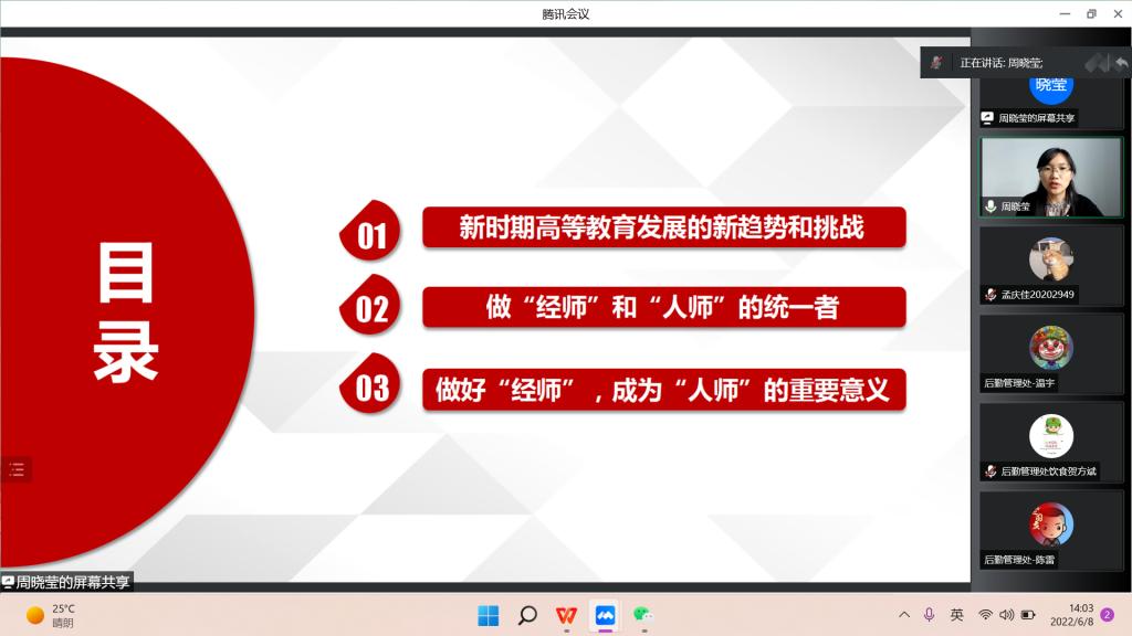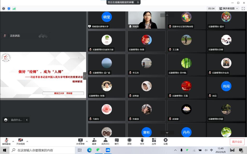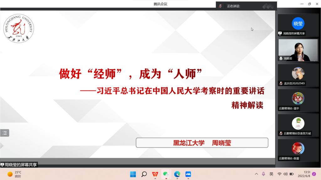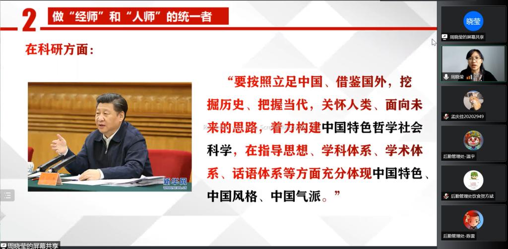 “能力作风建设年”活动“解放思想、振兴发展”研讨的工作要求,教育科学研究院与后勤管理处邀请哲学学院周晓莹老师于2022年6月8日14时,开展了《做好“经师”,成为“人师”——习近平总书记在中国人民大学考察时的重要讲话精神解读》基层宣讲会。会议由教育科学研究院副院长佟玉英主持,教育科学研究院全体师生党员及后勤管理处全处党员参加学习。