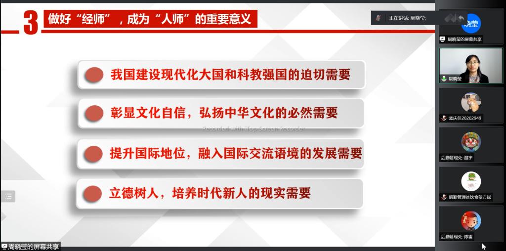 周晓莹老师从新时期高等教育发展的新趋势和挑战、做“经师”和“人师”的统一者、做好“经师”,成为“人师”的重要意义三个方面进行深刻阐释。她强调思想政治理论课是一门落实立德树人根本任务的关键课程,一位好老师不但是知识的传播者,更是崇高理想和高尚道德的培育者、学生成才的引路人。身为教师,我们要以全力以赴的干劲,坚决落实习近平总书记重要讲话精神,做好“经师”,成为“人师”,促进和推动育人事业高质量发展。