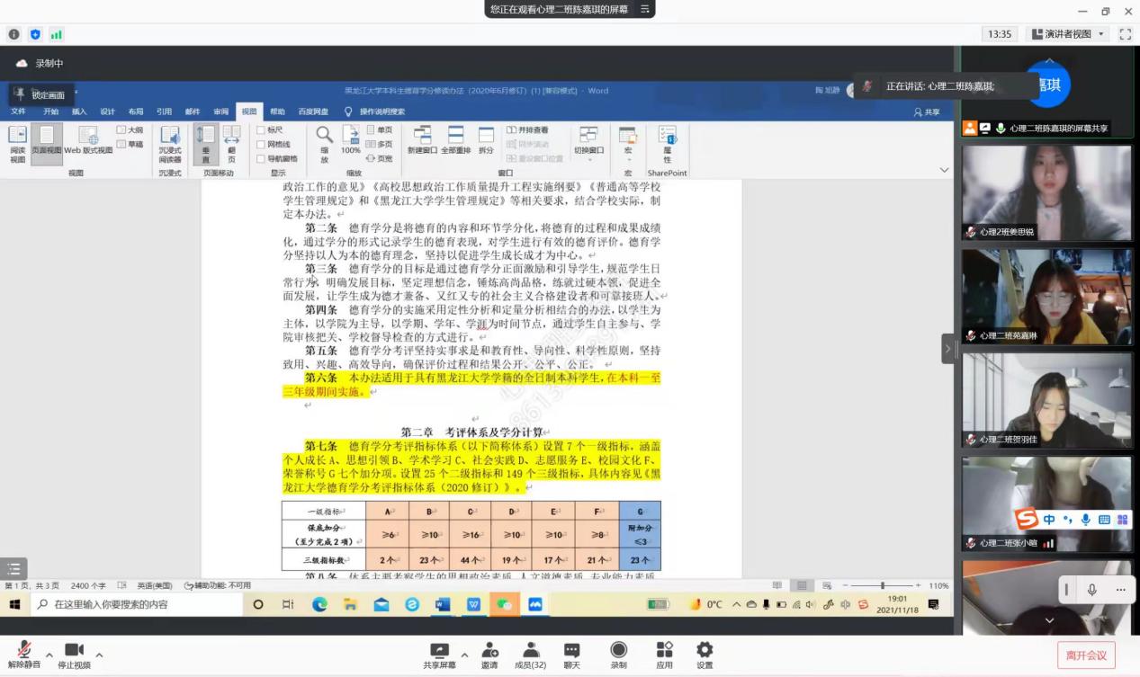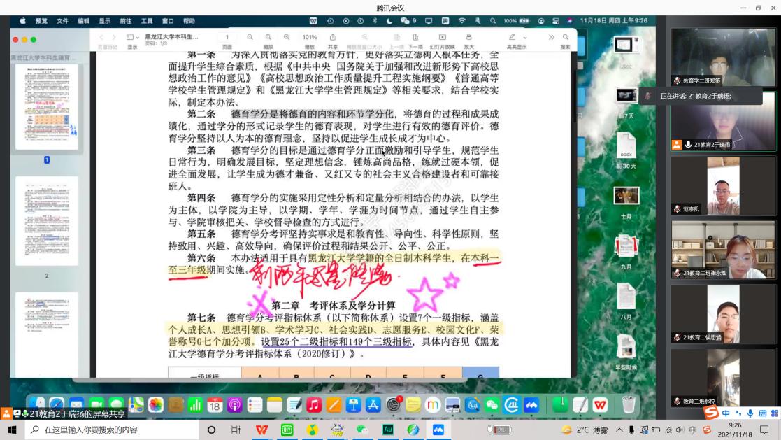 学生德育学分修读办法(2020修订)》,教育科学研究院于2021年11月15日、17日先后在汇文楼951室开展德育学分审核负责人培训会议、在腾讯会议平台开展德育学分修读办法解读会议。会议分别由2021级辅导员王馨莹老师、班级德育学分审核负责人主持,全体2021级同学参会。