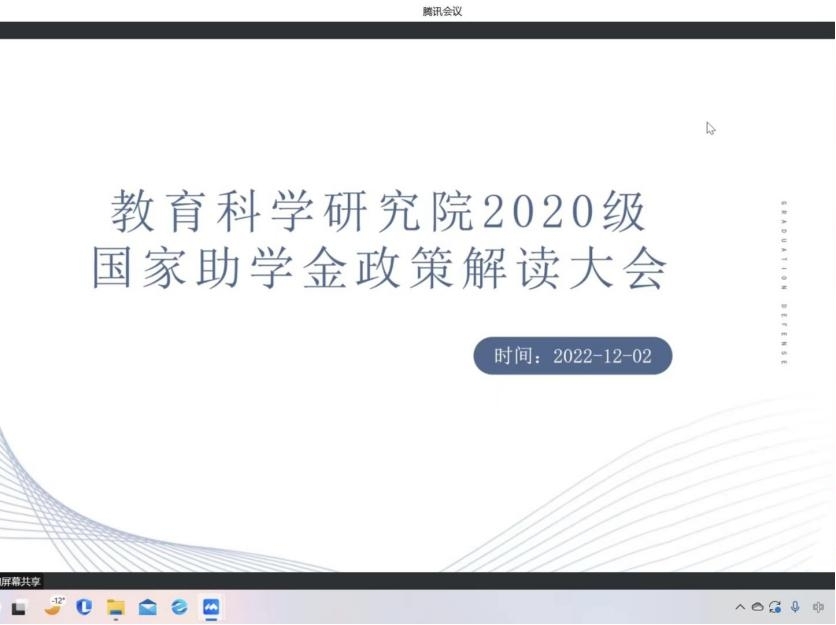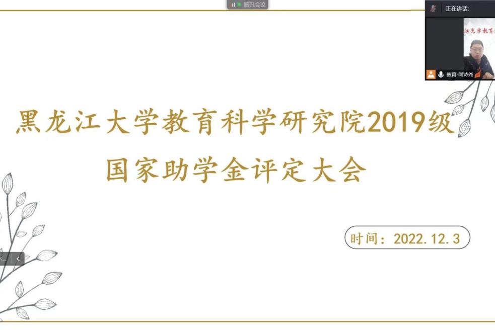 《学生工作部:关于评定2022年国家助学金的通知》的要求,本着公平、公正、公开的原则,根据教育科学研究院2022年家庭经济困难学生认定的实际情况,学院各年级于2022年12月1日至2日在腾讯会议平台开展2022年国家助学金评定大会,本次会议由各年级辅导员主持,各年级相关学生参会。