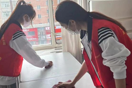 志愿者们擦拭桌椅、去除污渍、清洁地板,认真清扫每一个角落,并配合防疫要求,进行细致入微的消杀。