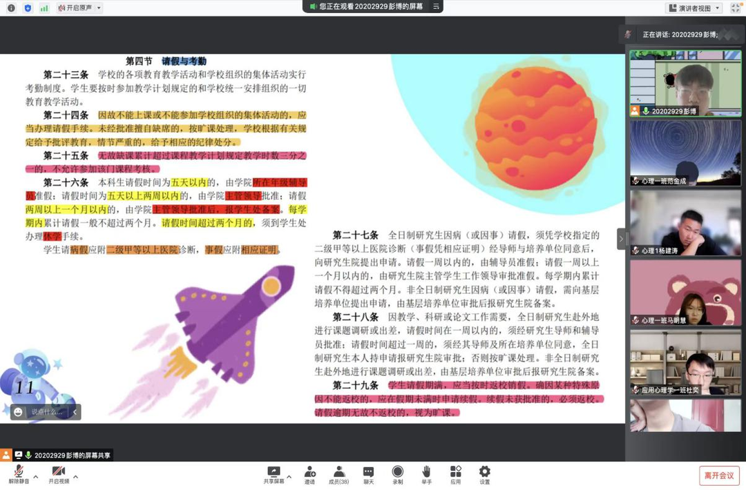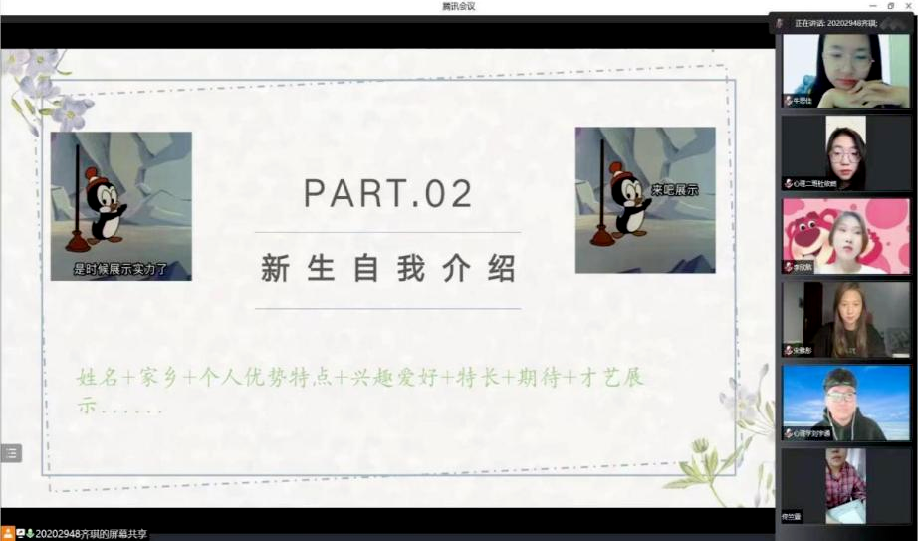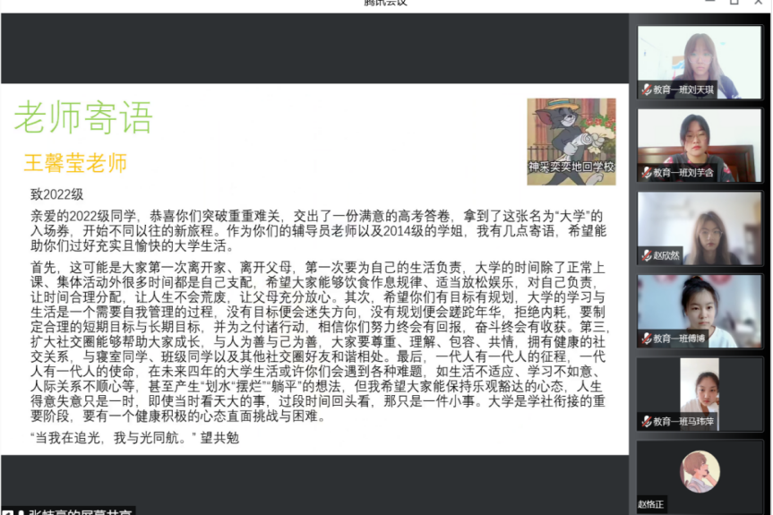 九月又一秋,盼君至此时。为了帮助大一新生顺利实现角色转换,更好地融入集体,提升新生班级凝聚力,教育科学研究院于9月7日18时30分,依托腾讯会议平台召开新生主题班会。此次班会由各班级带班任主持,2022级新生辅导员王馨莹老师、辅导员助理樊俐男老师、2022级全体同学参会。