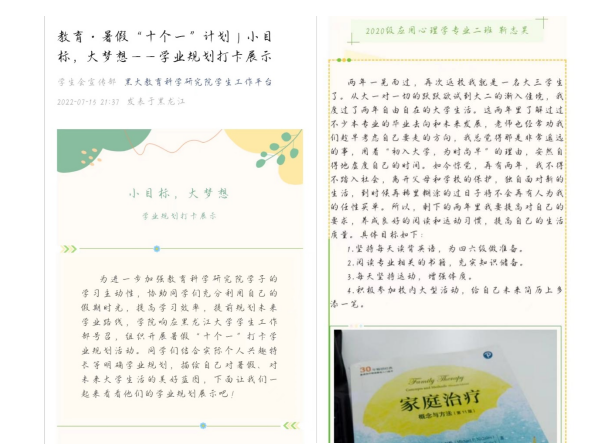 柏拉图曾说过“良好的开端等于成功的一半”,学业规划是一个良好的开端,制定新学期的计划会让我们对整个学期有明确的目标,让我们对新学期充满信心与期待。2022年7月9日——7月13日,我院举办了为期五天的“小目标,铸就大梦想——学业规划打卡”活动, 本次活动共有29名同学参与。在活动过程中同学们根据自身特点,将升学考试、考公考编、外语等级考试、学术科研任务等作为目标进行一定规划并细化分工、逐步推进,完成自身的学业规划,为学业后半程打下坚实的基础。新的学期计划书让我们目标的实现有了保证,在计划书的指导下,一步一步地完成自己既定的目标。让我们一起做到新学期新气象,努力奋斗成为最优秀的自己。
