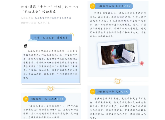 为深入学习贯彻习近平法治思想,推动青少年宪法学习宣传教育走深走实,教育科学研究院于暑期开展了打卡“宪法卫士”活动。通过此次活动,引导学生掌握宪法知识,树立宪法意识。本次活动让法治精神深入人心,营造尊法、学法、守法、用法的浓厚氛围,我院学子自觉成为宪法的忠实崇尚者、自觉遵守者和坚定捍卫者。