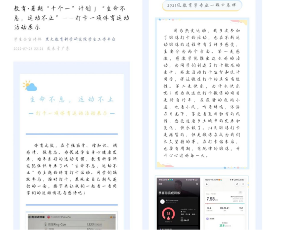 我院于7月11日——7月25日开展了为期14天的“生命不息,运动不止——打卡一项体育运动”活动。同学们积极参与体育锻炼,坚持每日健身并在规定时间内完成打卡,累计收到有效打卡291条。同学们的运动项目丰富,打卡形式多样,本次活动在暑假期间协助同学们形成坚持锻炼,养成积极向上精神面貌和健康体质的生活习惯。