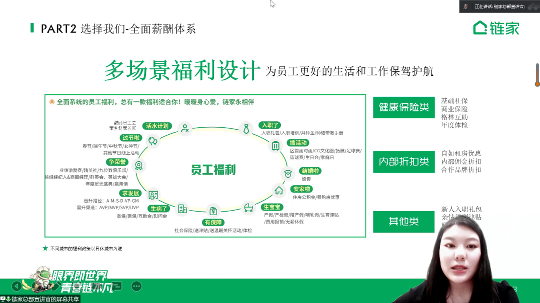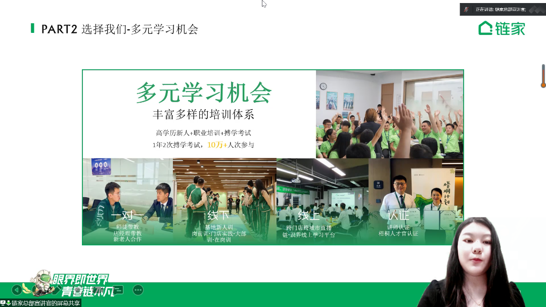 紧接着,链家宣讲老师向同学们讲解了入职流程、晋升通道等。链家拥有丰富多样的培训体系以及多元学习的机会,采用线上线下相结合的方式参与培训,晋升流程使用积分制,晋升速度平均18个月可以从房产经纪人晋升到门店经理。随后为同学们展示了国民美誉品牌的办公环境、住宿福利、链家互助金等福利待遇。