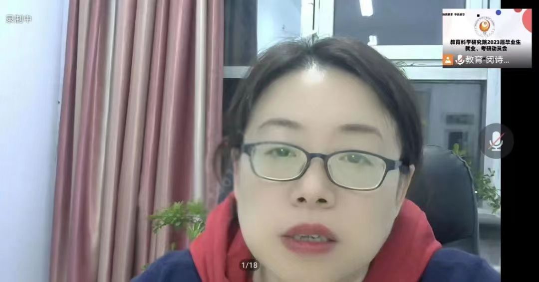 为切实推进2023届毕业生就业、考研工作,实现应届毕业生高质量就业,同时明确学生的就业、考研目标,在学院内,营造积极向上的学风。教育科学研究院于2022年5月3日19时30分线上开展“2023届毕业生就业、考研动员会”。本次会议由2023届辅导员闵诗尧主持,院党总支书记金鹏,院长王世红,院党总支副书记付丽,应用心理学教师王殿春出席,2023届毕业生及学生家长参加。