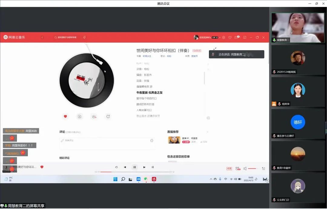 活动现场异常火爆,选手们满怀激情,用他们的奇妙歌声感染着观众的心灵,评论区观众热情高涨,纷纷为线上选手加油。姜倩同学的《我要你》温柔舒缓、徐烨成同学的《如愿》悠扬婉转、窦品兰同学的《开心往前飞》热情洋溢、王超同学的《小幸运》低沉动听,贺羽佳同学的《Holy》风格鲜明、王骏铮同学的《总有一天你会出现在我身边》余音缭绕、申晨祥同学和汪先洋同学合唱的《好汉歌》清脆淳朴、气势磅礴,将活动的气氛推向高潮,节目中的歌曲众多,风格也各不相同,有温柔抒情的情歌、有活泼欢脱的儿歌、还有别饶风致的说唱、多才多艺的选手们风格百变,惊艳四座......