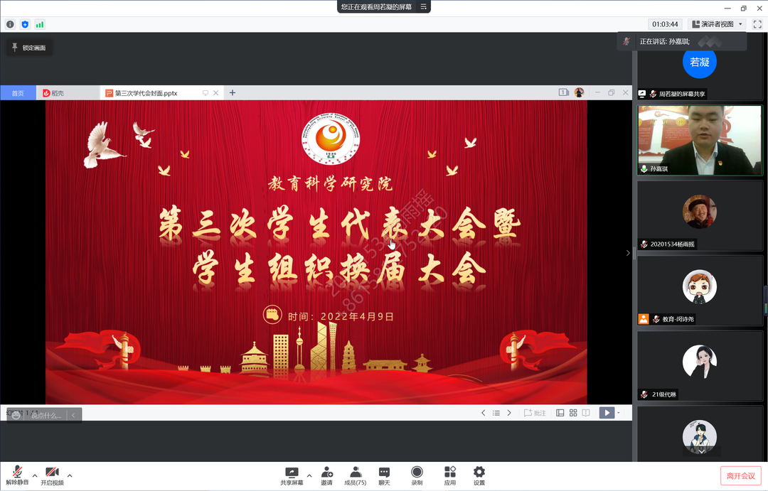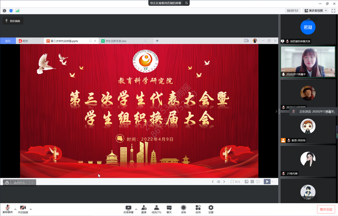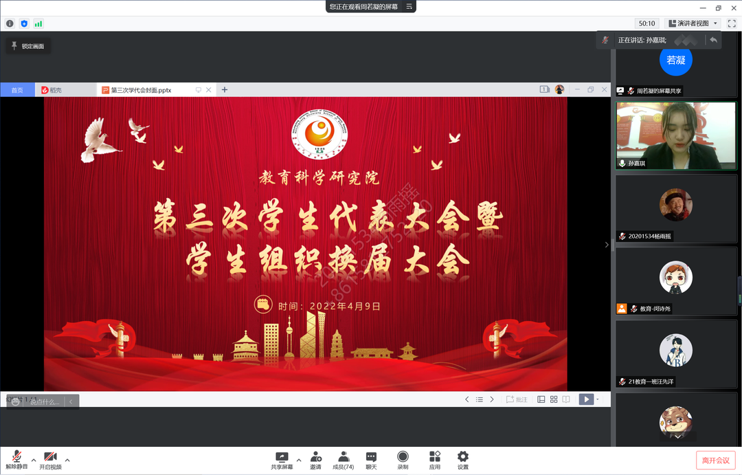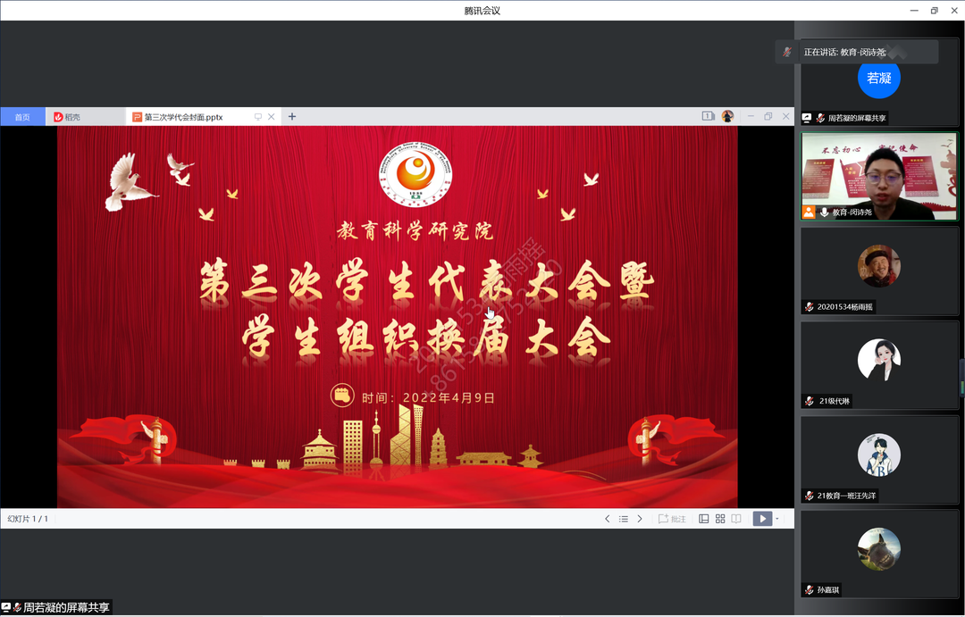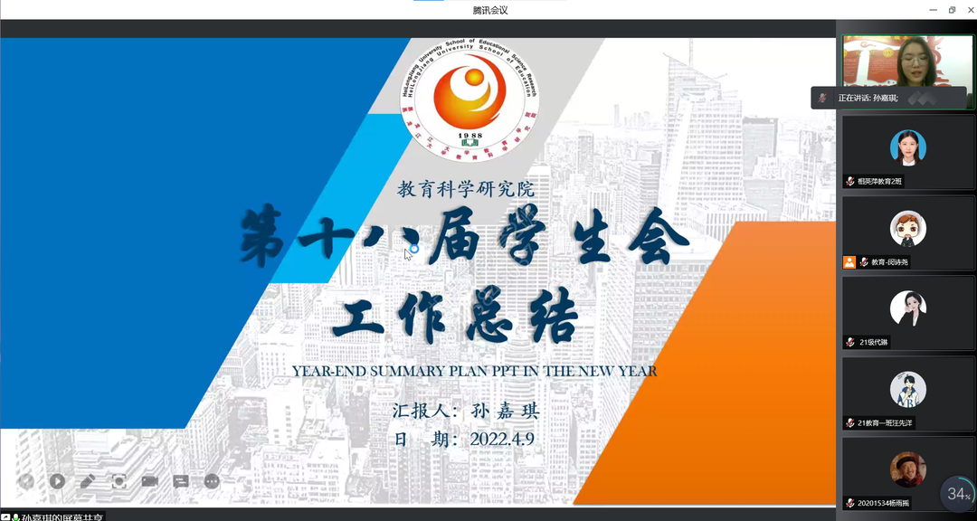 为深入贯彻习近平总书记关于青年工作的重要思想,进一步落实学校关于深化学生组织改革的要求,加强学院学生管理工作及学院学生组织建设,支持和引导学生会更好地服务青年学生成长成才,从而全面提高学院学生组织干部的综合能力,教育科学研究院于2022年4月9日上午9时,通过腾讯会议平台召开第三届学生代表大会暨第十九届学生会、第五届青年志愿者协会主席团换届选举大会。