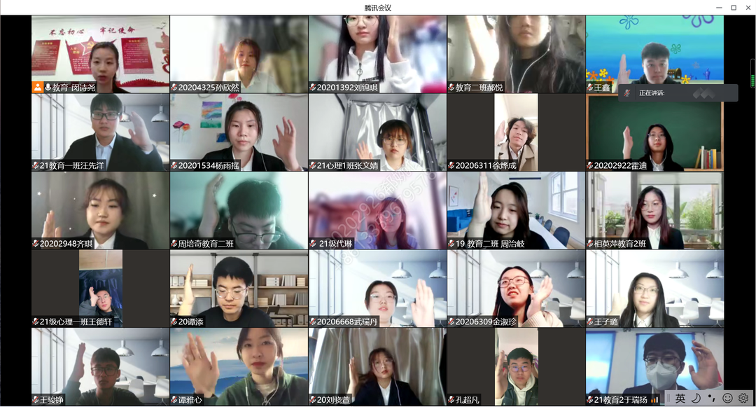 出席本次大会的领导及老师有:教育科学研究院党总支副书记付丽,院团委书记、2019级辅导员闵诗尧,院团委副书记、2018级、2020级辅导员梁曼,2021级辅导员王馨莹,教育科学研究院第十八届学生会、第四届青年志愿者协会全体成员,各年级学生代表,共计69名同学参加本次会议。