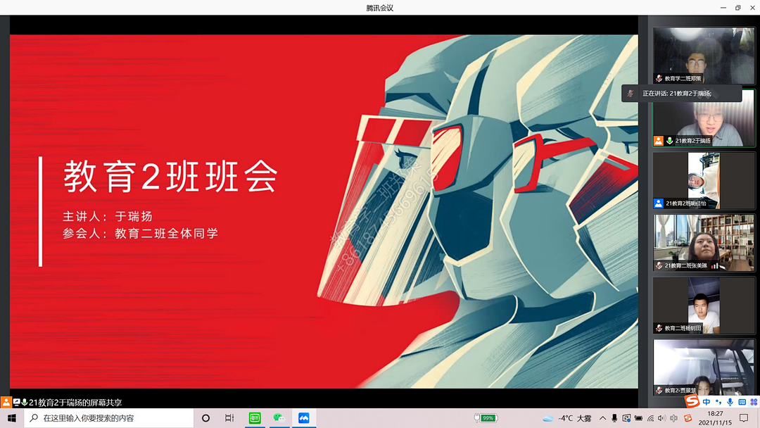 为了进一步帮助2021级新生更加科学地规划大学生活,明确学习目的并树立奋斗目标,2021年11月15日18时30分教育科学研究院于腾讯会议平台召开第二次班会,班会由2021级各班班长主持,各班班长、生活委员、学习委员主讲。本次班会共分为三个部分,分别为集体学习《贝勒漫画