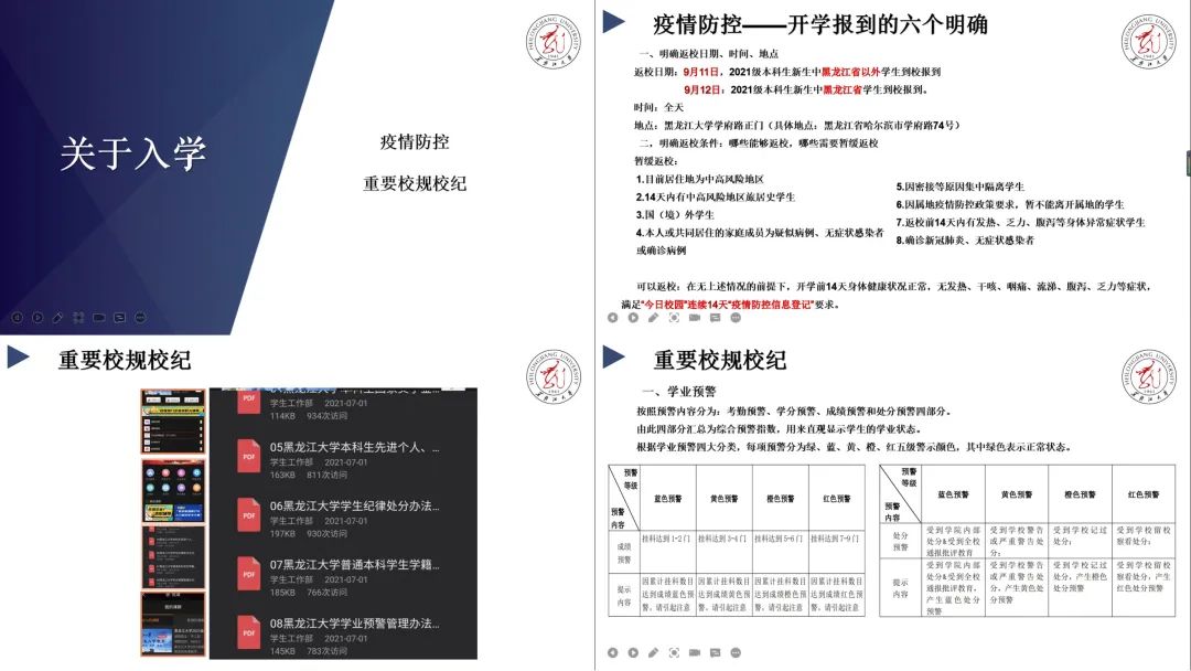 本次大会分为三个议程。会议第一项,辅导员王馨莹老师以“五个关于”为主题,分别为“关于辅导员”“关于2021级”“关于学院”“关于黑大”“关于入学”。
