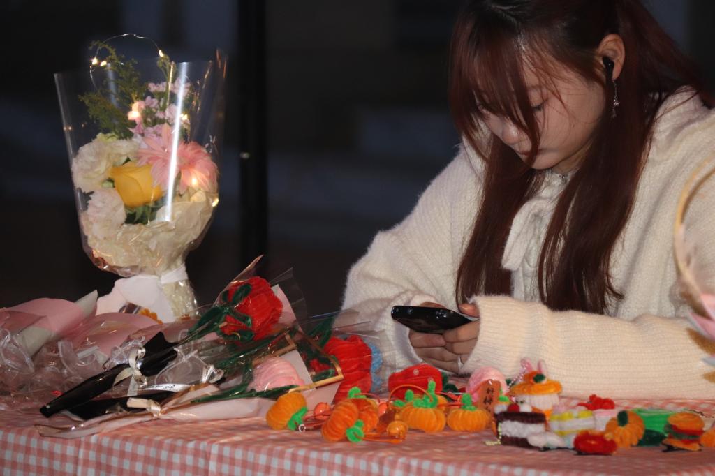 本次创意集市摊位商品丰富多样,有琳琅满目的首饰、精致的手作、可爱的摆件、芬芳的花卉和富含哲理的书籍。这些商品在灯串的映照下镀上了柔和的光晕。天气乍暖还寒,伴随着校园十佳歌手美妙的歌声,同学们热情高涨,创意集市人流如潮。